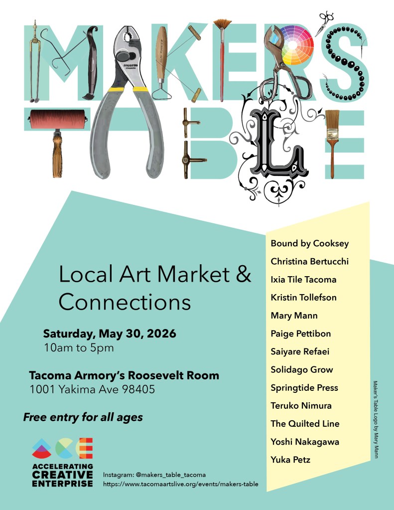 Maker’s Table is a local art market on 5/30/26 at the Tacoma Armory’s Roosevelt Room. Find affordable ceramics, fiber arts, glasswork, jewelry, original prints, paintings, and works on paper! Free entry for all ages, the event features thirteen South Sound artists selling their artwork and connecting with the community: