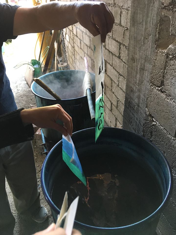 Using natural dyes to incorporate into hand printed linocuts and mobiles. Workshop on indigo & cochineal dyeing techniques taught by Arte Seda in Teotitlan del Valle, Oaxaca, Mexico.