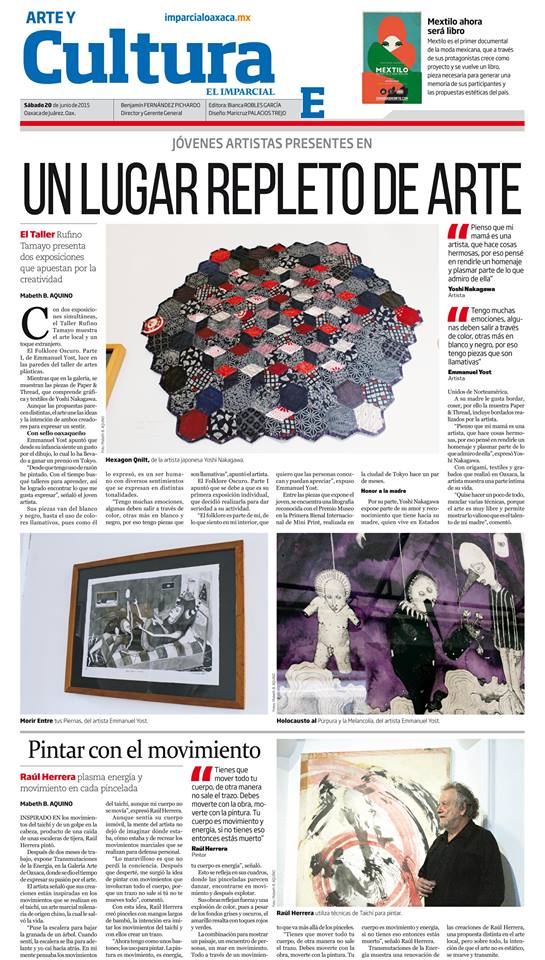 Azahar Mabeth Bolaños Aquino, “Un Lugar Repleto de Arte,” Art & Culture, El Imparcial, Oaxaca de Juárez, México, 20 June 2015. http://imparcialoaxaca.mx/arte-y-cultura/4eN/un-lugar-repleto-de-arte
