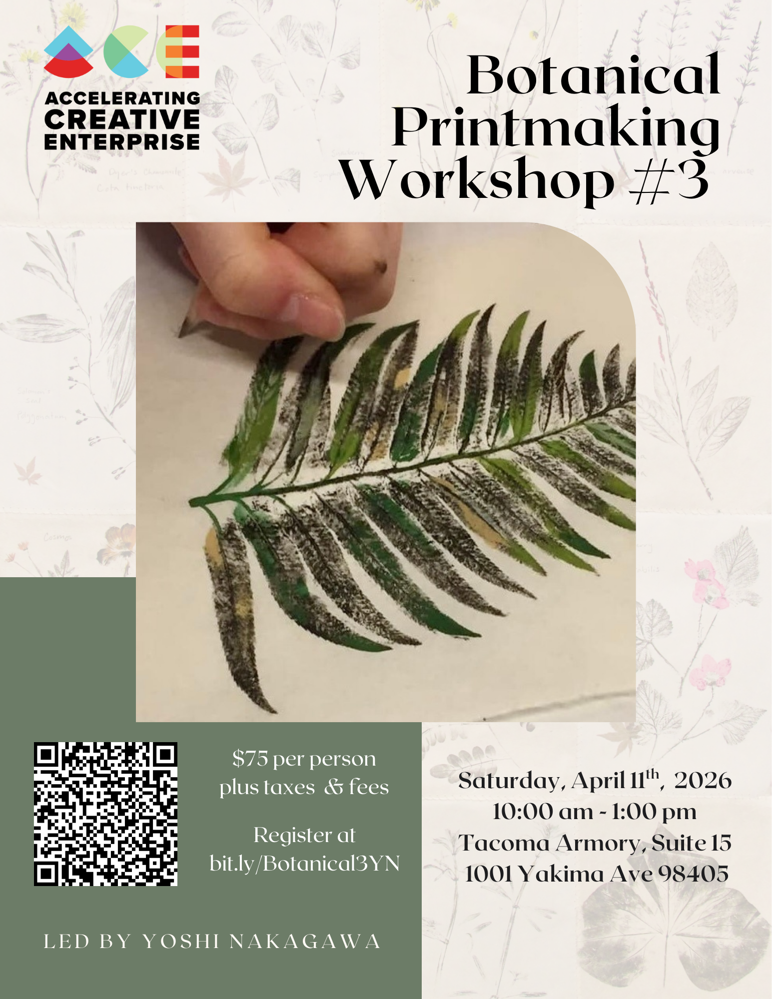 Get in touch with the natural world & printmaking—join us at the Tacoma Armory, Suite 15 for the Botanical Printmaking Workshop on Saturday, April 11th, 10am-1pm. I’ll guide you through the process of rolling on oil-based ink on the plants with a brayer, and hand printing proofs and at least two washi (mulberry paper) prints to take home. We can add color with water-based pigments. This is a technique you can do at home once you have the materials and even print on textiles and fabric. Be a naturalist & artist with no experience necessary! More info & register at bit.ly/Botanical3YN
